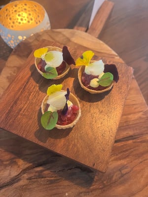 'Oreo' van rode biet / Creme Fraich / Limoen / Wasabi