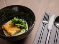 Luchtige knolselderij / komkommer chutney / oester / krokante aardappel / zilte plantjes