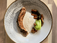 Toarched Salmon "Mi cuit" - Slow cooked salmon glazed in white miso, dashi foam, pok choi