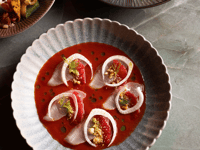 Seabream Tiradito - Red leche de tigre, green mango, crispy corn