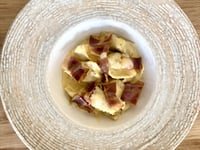 Agnolotti "Carbonari" - Homemade agnolotti pasta stuffed with ricotta and pecorino cheese, Carbonara sauce, Sardinian guanciale